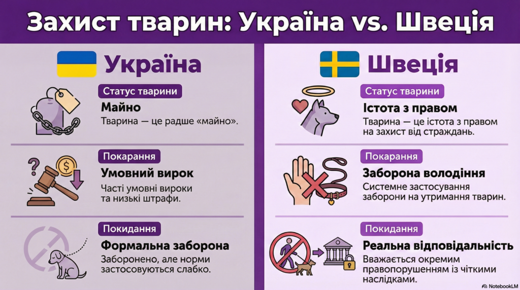 В Україні закон уже на боці тварин — він забороняє покидати, мучити, утримувати в неналежних умовах. Але поки що він працює лише там, де є гучний резонанс і небайдужі люди. У Швеції та інших країнах ЄС тварина має значно більше шансів на справедливість: там держава системно карає тих, хто зраджує довіру чотирилапих.